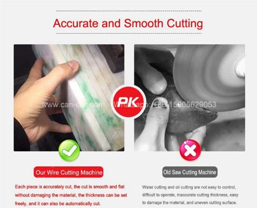 Hver del er nøyaktig kuttet, kuttet er glatt og flatt uten å skade materialet, tykkelsen kan stilles fritt, og den kan også kuttes automatisk.